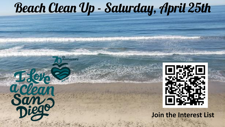 A group is forming to participate in a beach clean up day in conjunction with I Love a Clean San Diego’s 70th anniversary. Click here to join the interest list and receive further information.